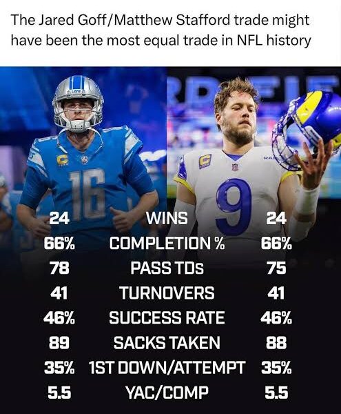 “Matthew Stafford is projected to surpass Jared Goff in career wins as a Rams quarterback sometime this season. Meanwhile, Jared Goff is projected to surpass Matthew Stafford in career wins as a Lions quarterback by 2027,” Brett Kollmann posted on X.